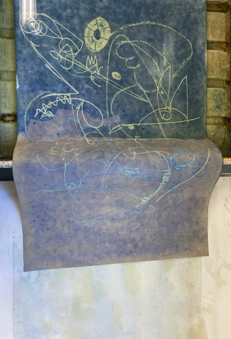 Designs were exposed as cyanotypes, using a naturally uv-sensitive solution of iron salts to create a beautiful indgo blue, Benaiah selected a hemp paper by G.F.Smith as this tied in with materials from the project and his research.
