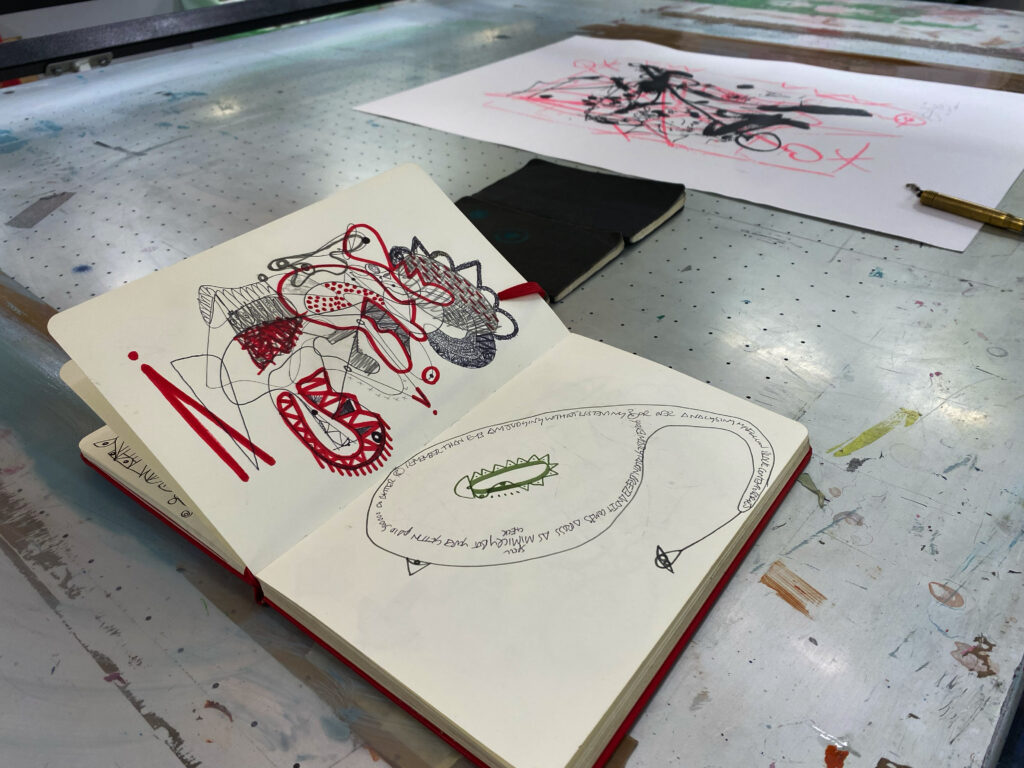 After our initial workshop session, we decided to create screenprint designs directly from Benaiah’s drawings- featuring his original script for the invitation text and his signature.
